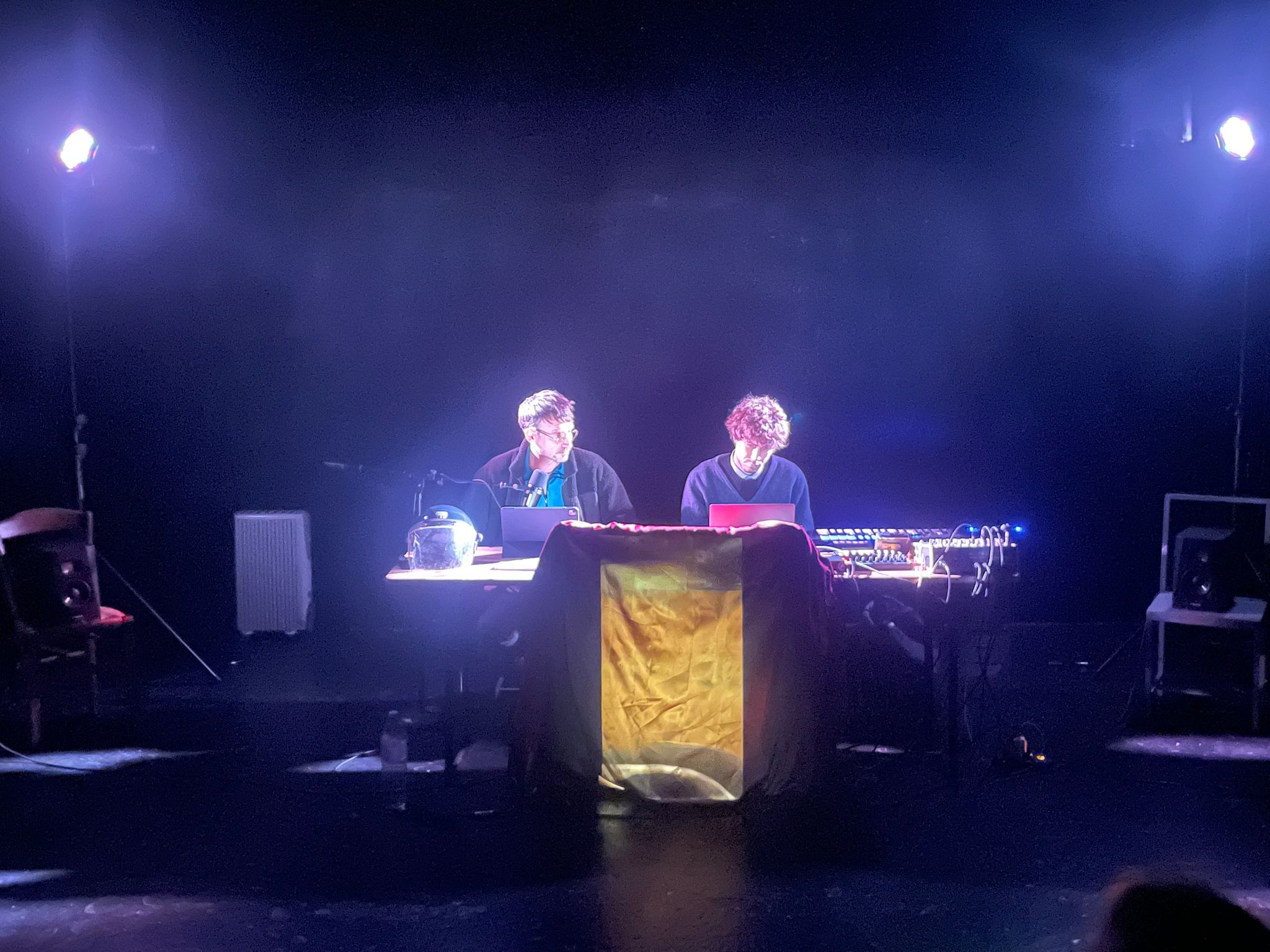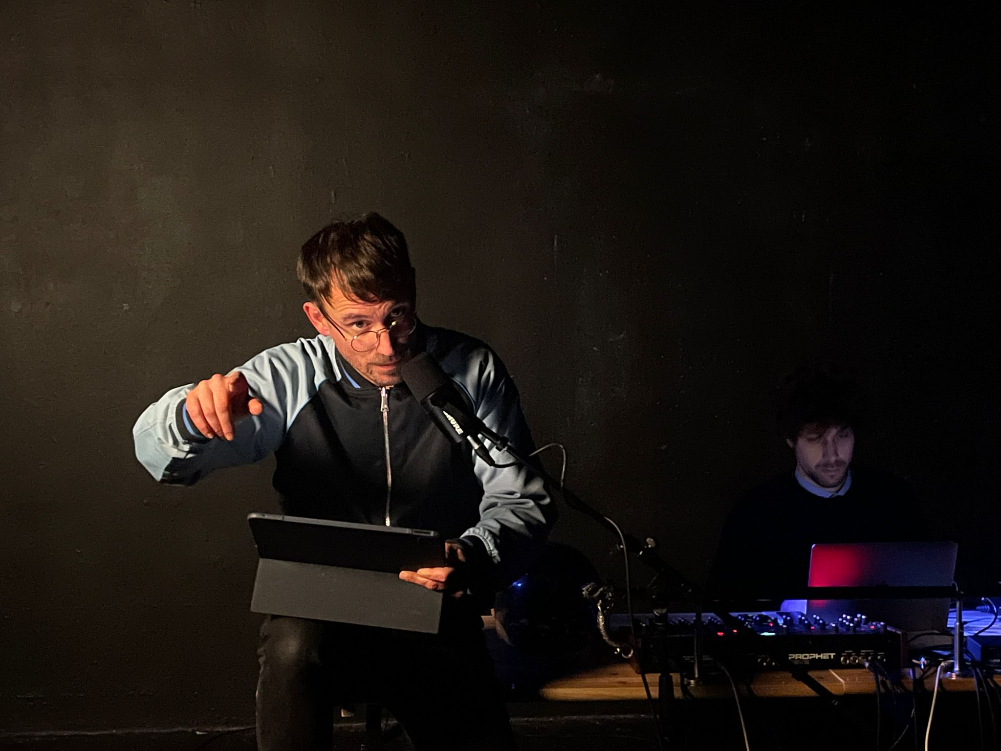 Force Bleus se déploie comme une forme scénique légère, pensée pour mettre le réel au travail sans l’illustrer. Le spectacle s’appuie sur la présence de Thomas Gourdy au plateau, sur un jeu de glissements entre les voix, sur des objets et des archives, et sur la musique jouée en direct par Alexandre du Closel.