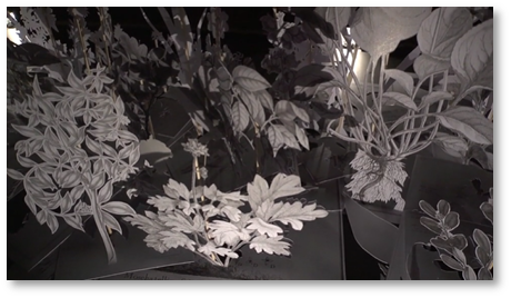 Thus, the installation Jardin de Papier reveals the engravings of an 18th-century botanical encyclopedia through the cutting out and standing up of its plant illustrations, enhanced by sound and moving lights.