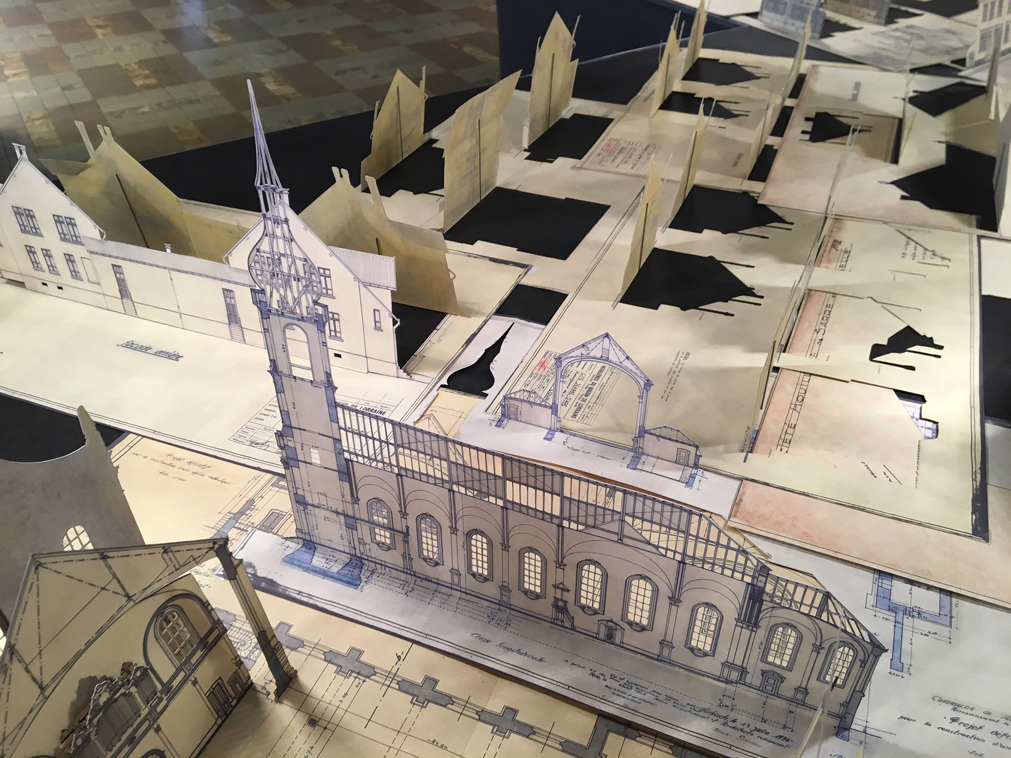 The participatory documentary installation Culture Fabrique, created for the 40+1 anniversary of the Kulturfabrik in Esch-sur-Alzette, also extends this cycle: nearly 850 archives are printed, cut out, and recomposed into three-dimensional collages across several tables, with the participation of local residents.