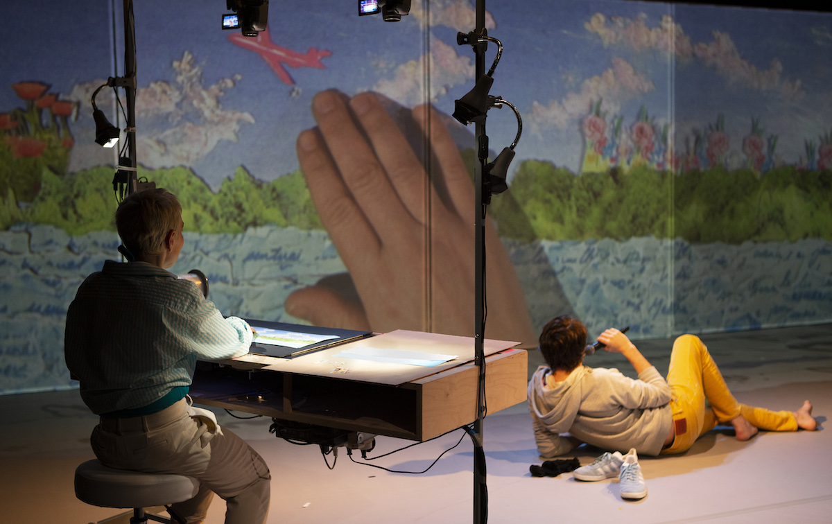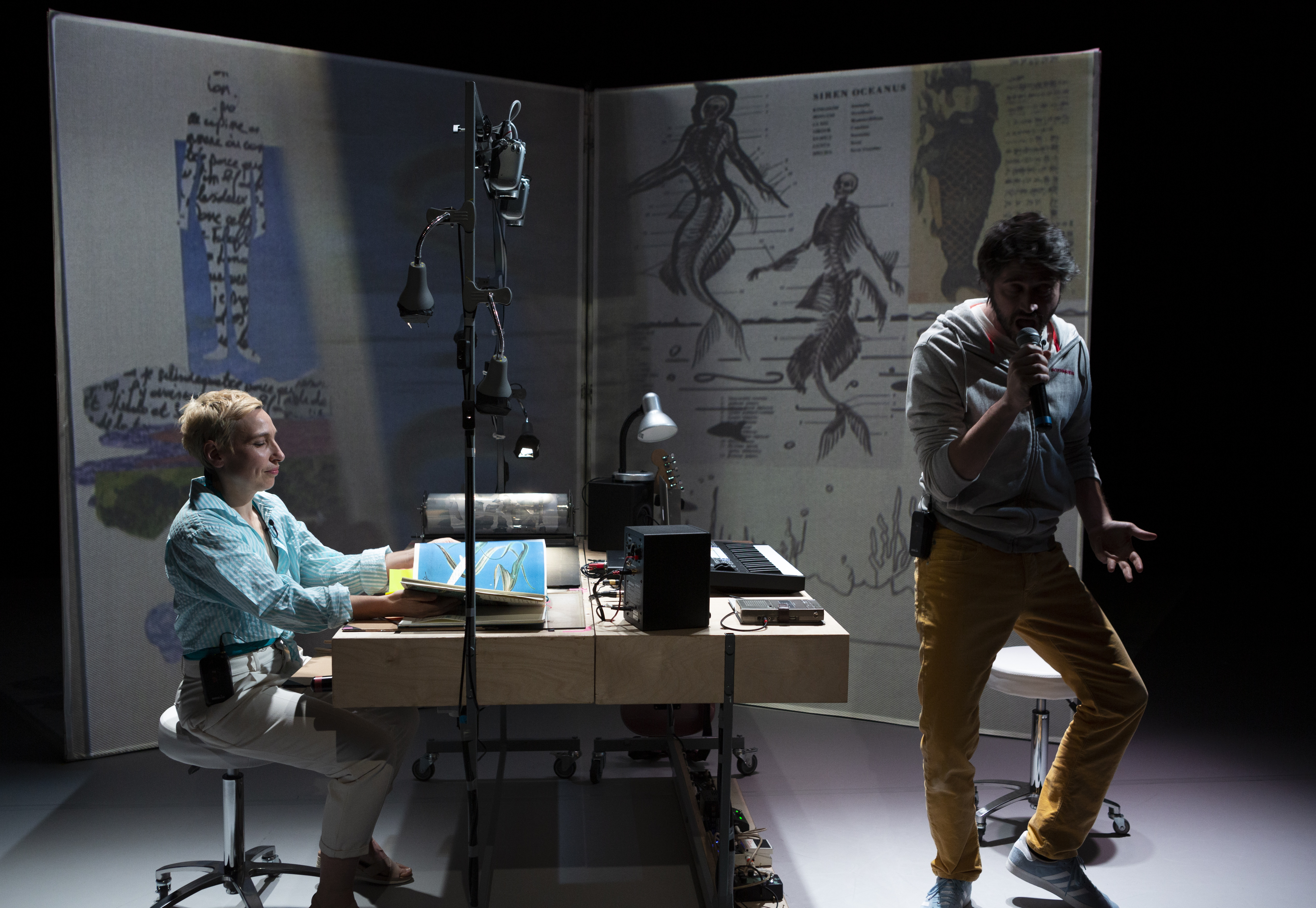 Graphic storytelling, musical compositions, image manipulation, and drawn or sung voices: the stage becomes a living editing space where we read, listen, trace, and perform.